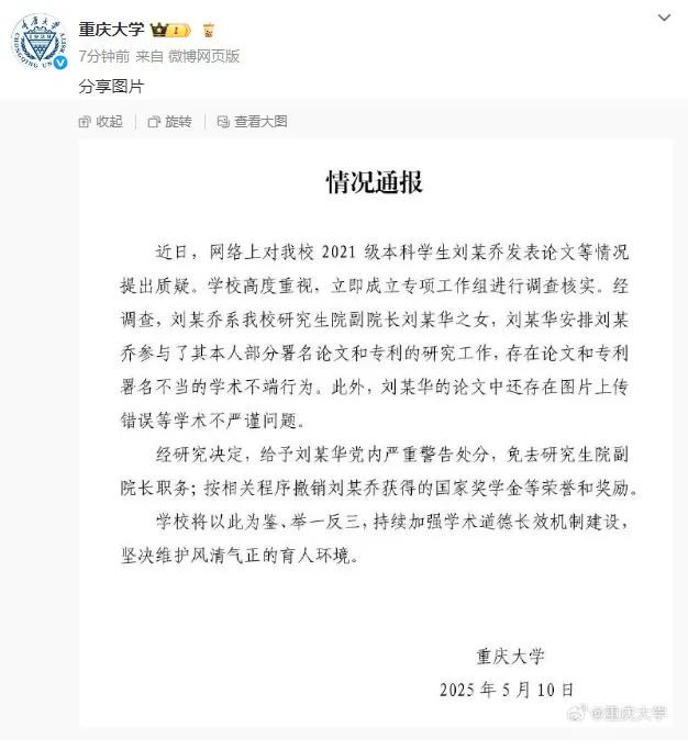 重庆大学通报“本科生已发14篇SCI论文”处理结果: 免去涉事学生父亲的副院长职务