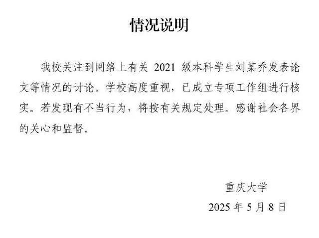 5月8日晚,重庆大学发布情况说明:“我校关注到网络上有关2021级本科学生刘某乔发表论文等情况的讨论。学校高度重视,已成立专项工作组进行核实。若发现有不当行为,将按有关规定处理。感谢社会各界的关心和监督。”